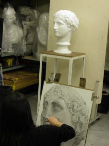 アトリエAでは初心者を中心に石膏デッサンの制作指導がありました。基礎的な石膏像を今回モチーフとして準備しましたが、彫刻そして人の顔というものは初心者にとって、いきなり立体的に描くというのは難しいですね。如何に画材を駆使しながら、マッス(量塊)と彫刻としての印象を表すか。そのバランスと初歩的なデッサンの進め方をアドバイスしました。