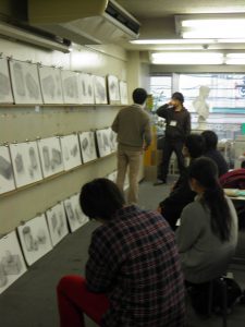 晴天の天候でしたが朝は寒かったですが、午前8時過ぎから続々と無料デッサン体験参加の生徒が入室してきました。参加表、アンケート用紙を貰って課題別にアトリエに入っていきます。